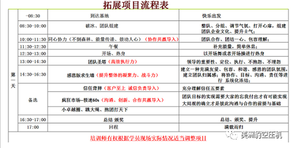 1、明确团队的目标,提升员工的团队精神和团队意识。通过明确的分工合作,提高团队共同面对问题时更好处理问题的能力,锻炼团队为了共同的目标而相互配合,更好、更快的完成任务。
