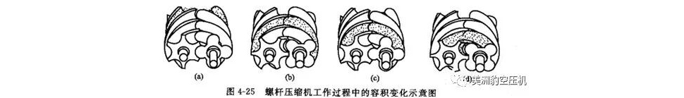 随着转子的继续回转,上述过程重复进行。图4—29显示了螺杆空压机中所指定的一齿间容积排放的工作过程。