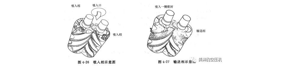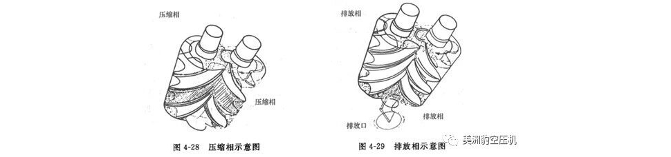 在压缩相示意图(图4—28)中,在进口端两螺杆啮合开始时捕捉的气体体积减小,随着两螺杆逐渐地螺旋运动补充的气体在输送中进入排气端.并在排气端压缩。叶片啮合点螺旋方向运动